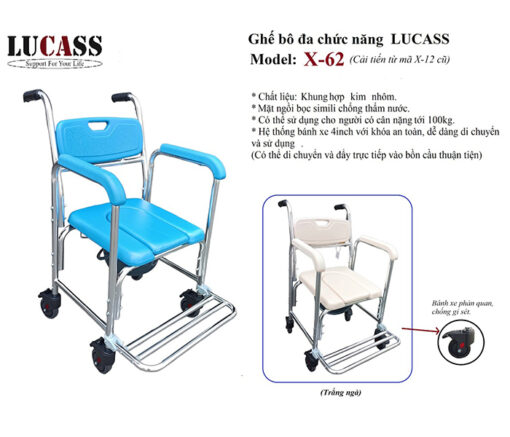 Ghế bô vệ sinh- ghế tắm Lucass X-62 là chiếc ghế bô đa năng, mặt ngồi không thấm nước, có thể dùng để tắm cho bệnh nhân, di chuyển vào bồn cầu dễ dàng.