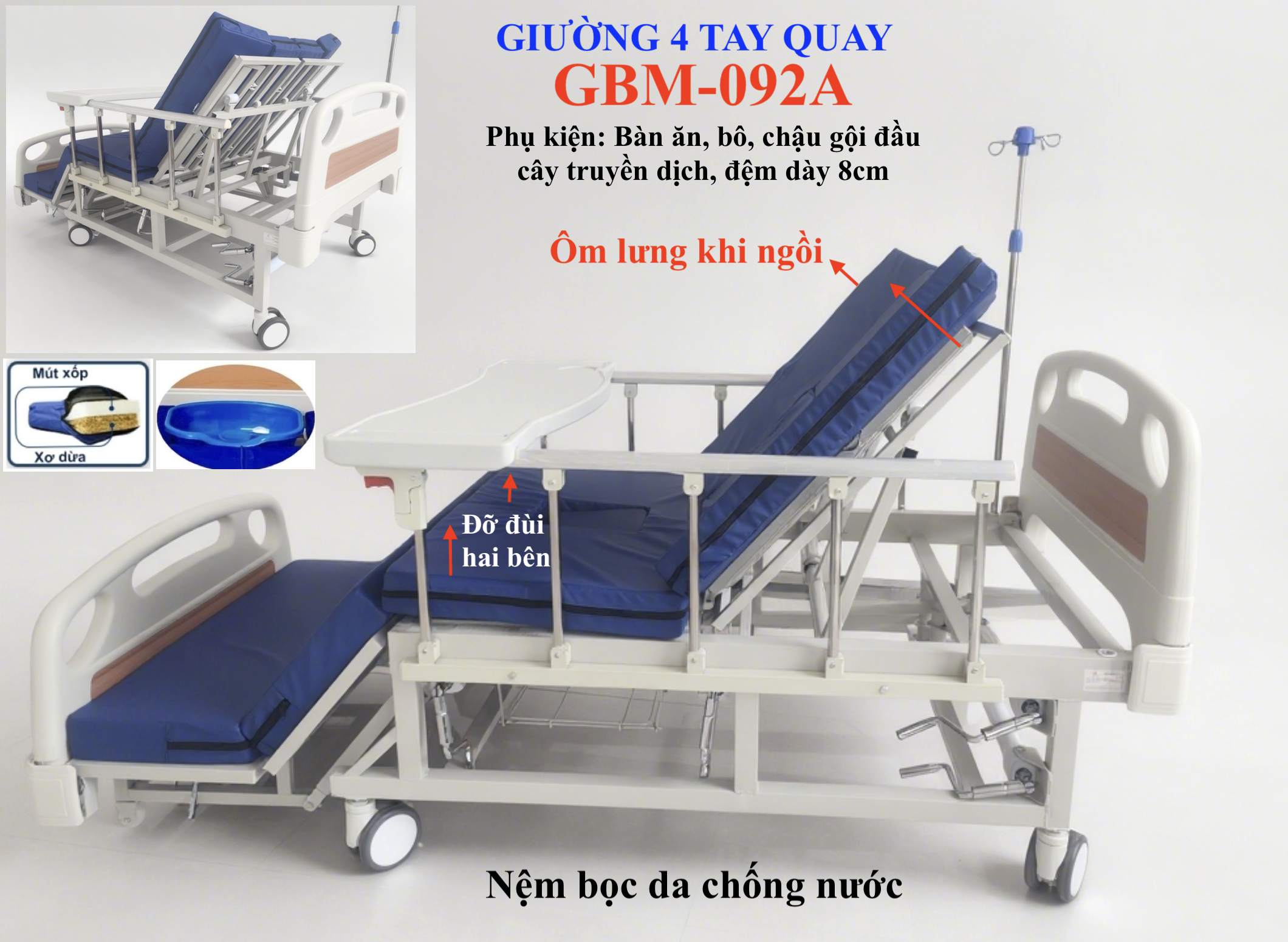 Giường nhân 04 tay quay GBM-092A của hãng thiết bị y tế GBM sản xuất theo công nghệ tiên tiến nhất của Nhật Bản, được tin dùng và đánh giá cao trong lĩnh vực chăm sóc và điều trị người bệnh tại nhà hay tại bệnh viện. Giường được sản xuất đạt tiêu chuẩn để xuất vào thị trường Châu Âu nên chúng tôi cam kết và đảm bảo chất lượng sản phẩm tốt
