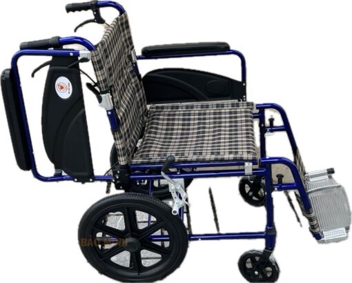 – Đây là một chiếc xe lăn cao cấp bởi toàn bộ khung xe được thiết kế bằng hợp kim NHÔM rất gọn nhẹ, sang trọng, tính mỹ thuật cao, không bị han gỉ, tay tì có thể lật lên để bệnh nhân vào dễ dàng hơn từ hai bên hông xe, tựa lưng và giá để chân có thể gấp gọn